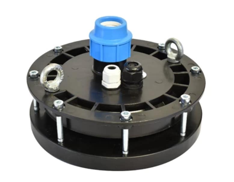 HDPE-Brunnenkopf 125 mm zur sicheren Montage einer Brunnenpumpe in einem Brunnen bis 125 mm. Dieser PVC-Quellenkopf ist mit Anschlüssen ausgestattet, die an die Quelle geklebt werden können, und einem abnehmbaren Flansch.