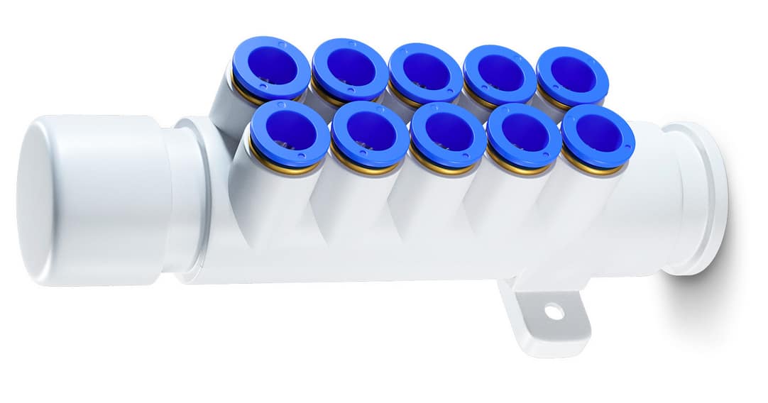 Der Verteiler verfügt dann über 10 Anschlüsse, darunter ein Anschluss für einen 10-mm-PU-Schlauch.
