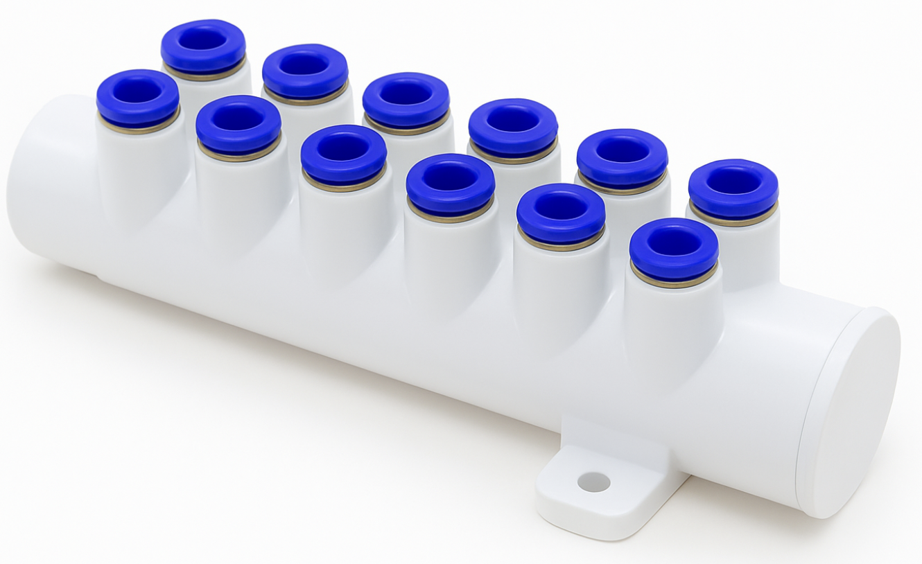 Der Verteiler verfügt über 10 Anschlüsse für 10 mm PU-Schlauch und ist ideal, um die Luftverteilung in Ihrem System zu verbessern.