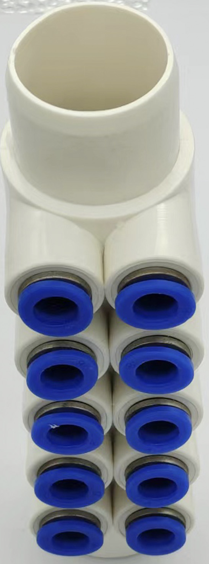 - Technische Daten: PVC-Material, 10 Ausgänge, geeignet für 10 Düsen, Eingang für 10 mm Luftschlauch, glatte Oberfläche.