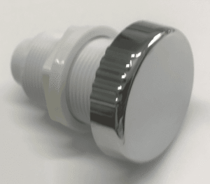 Der Hydromassageknopf dient zur Regulierung der Luftzufuhr zu den Wasserdüsen. Für eine effektivere Massage kann dem Wasserstrahl Luft zugeführt werden. Dieses verchromte Bauteil hat einen Durchmesser von ca. 50 mm; eine Vierteldrehung des Knopfes öffnet und schließt es vollständig. Die Luft wird von unten in die Wanne angesaugt. Der Regler ist mit einem Rückschlagventil ausgestattet, um sicherzustellen, dass nur Luft angesaugt wird. Ein 20 mm PVC-Schlauch ist an der Unterseite des Reglers verklebt. Der Griff wird durch die Öffnung im Wannenrand gesteckt und mit einer Mutter an der Unterseite befestigt. Für eine einwandfreie Funktion muss der Griff senkrecht montiert sein: Der Schlauchanschluss muss senkrecht nach unten zeigen.
